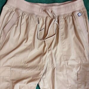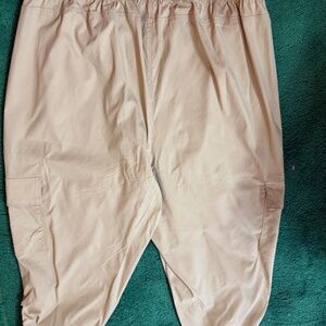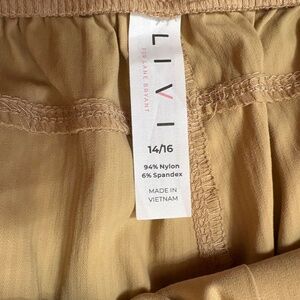 LIVI ACTIVE BY LANE BRYANT CAPRIS 14-16 TAN NWOT Cargo-type capris with ruched adjustable elastic legs at hem; two cargo pockets and two side pockets; 2" elastic waistband with matching drawstring; front seam; 17" waist; 23" inseam; 94% nylon 6% spandex; machine wash cold when needed tumble dry low cool iron if needed. Feel like soft parachute material; comfortable and look great on. Picture may look wrinkled but they are clean, ready to wear and have been ironed with cool iron.