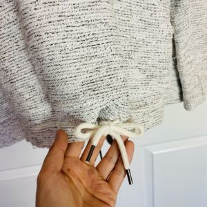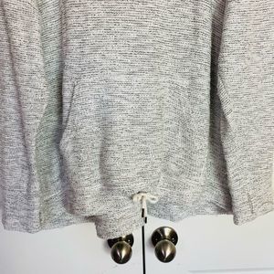 Cowl neck. Long drop-shoulder sleeves. Drawstring hem. Waffle knit. Slightly longer length.