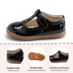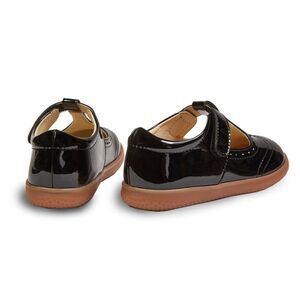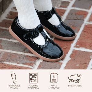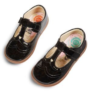 Stylish and comfortable black patent leather shoes for kids. Perfect for any occasion. Introducing a Sweetheart Style: Our adorable t-strap boasts a charming cut-out heart detail, capturing the magic of childhood. Plus, it's a breeze to care for with our EZCare™ vegan material that's washable, ensuring both style and convenience for your little one. Experience the joy!