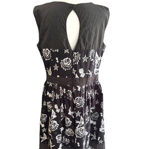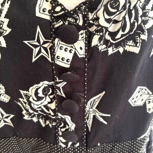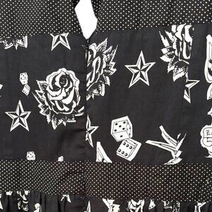 Black and White with Roses, Stars, Dice, and Sparrows Pattern / Polka Dot Detail at Top, Waist, and Hem