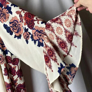 LIVING DOLL LOS ANGELAS WO SIZE 22/24(?). TOP CREAM COLOR NAVY RUST MAUVE WIME SALMON FLORAL DESIGN FLOWY WIDE SLEEVES WITH SOFT RUFFLE RUSCHED ELASTIC COLLOR PULL OBER TOP SIZE TAG IS MOSSING. UT LENGTH MEASURES APPROX 29” FROM SHOULDER TO HEM SLEEVES MEASURE APPROX 21” CHEST / HIPS MEASURE APPROX 26” FROM SIDE TO SIDE VERY GOOD CLEAN CONDITION