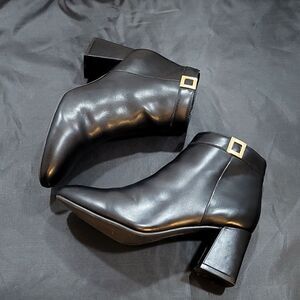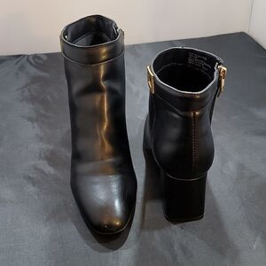 LIZ CLAIBORNE LC MACOMB ALMOND TOE BLOCK HEEL BOOTIE SIZE 61/2M COLOR BLACK These Liz Claiborne booties will make a classy addition to your rotation. Made from smooth faux leather, these pointed-toe boots have a 2.75-inch block heel, a gold-tone embellished strap overlay, and a side zip closure. Style them with a shift dress or slim-fit jeans and a blouse.Features: Memory Foam Closure Type: Zipper Footwear Technology: Memory Foam Insole Shaft Circumference Inches Upper/Outer Base Material: 100% Polyurethene Shoe Lining Material: Fabric Sole Material Content: 100% Thermoplastic-Rubber Toe Type: Closed Toe Heel Style: Block Heel Country of Origin THIS ITEMS IS PRE-OWNED EXCELLENT CONDITION WITH ONLY LIGHT SIGNS OF WEAR IF ANY CHECK THE PICTURES