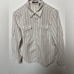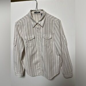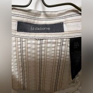 LIZ CLAIBORNE SIZE L. GRAY AND TAN TWO FRONT POCKETS. BUTTON UP FRONT