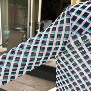 LIZ CLAIBORNE. SIZE: LARGE. MATERIAL: 100%. NEW WITH TAGS THAT FELL OFF - ONLY THE PLASTIC REMAINS BUT I FOUND A TINY "RUN" DOWN THE BACK IT'S ABOUT ONE THREAD WIDE - NOT REALLY VISIBLE BUT I CHECKED REALLY CLOSELY - PRETTY GEOMETRIC DESIGN. MATERIAL: 100% POLYESTER
