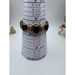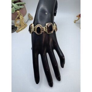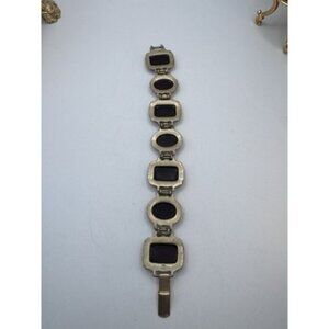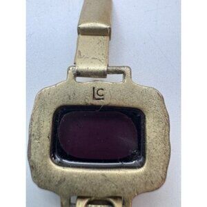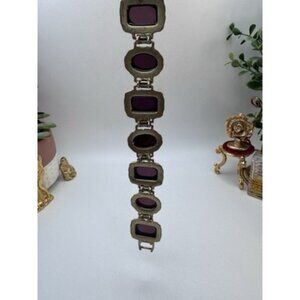 The product is a vintage Liz Claiborne signed bracelet featuring purple glass cabochons set in gold tone metal.