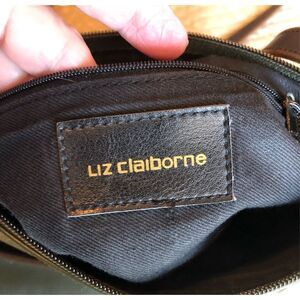 This vintage Liz Claiborne Crossbody is tailored and pretty and it’s hunter green with brown trim.  She’s 10” x 8.5” x 4”, with a buckled and adjustable strap drop shown at 20” (can expand another 3 to 4 inches). Cute brown trim on front with embossed Liz Claiborne logo And on the bags bottom. Front zippered compartment with a cute pull tab. Very minimal gold-tone hardware. Zippered top entry with pulltab. Clean black fabric lining with zippered compartment and Liz Claiborne logo patch. Adorable bag, but tiny and unnoticeable peeling in places. There is also a faint white mark on the bottom corner (shown in photo). Strap and corners in good condition. Very pretty vintage bag in good preowned condition.