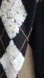 Black background of acrylic and wool blend. Decoration is on the front only and is argyle made of diamond shapes (made of ivory iridescent sequins) criss-crossed with gold beaded thread. Removable shoulder pads.