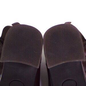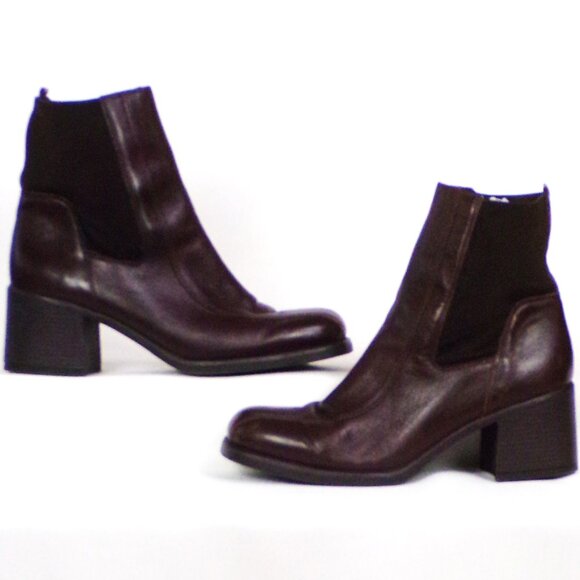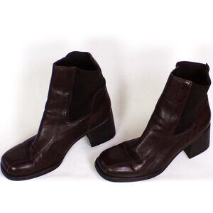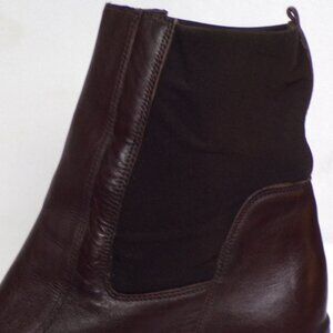 THESE HANDSOME BROWN MID-HEEL SQUARE-TOE ANKLE BOOTS BY LIZ CLAIBORNE, SIZE 9M, MODEL NAME COLLINA, are gently pre-owned, in excellent condition. There is light creasing of the upper fronts where they bend when walking and slight wear at the backs of the heel tops (picture #15), but they are otherwise free of defects, damage, or signs of wear. The uppers are leather except for stretchy fabric panels in the upper sides and backs. The stated size is 9M, but prospective buyers are encouraged to compare the measurements with those of boots or shoes that they know fit well prior to purchase. Inside measurements are: length, heel to toe 10”; widest point 3”; narrowest point 2”. Heel height is 2 7/8”, boot height 8.25". (As is usually the case with boots, it's impossible to get down inside with a tape measure, so inside measurements are my best estimates based on outside dimensions.)