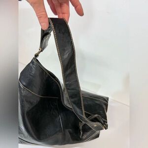 Black faux leather Hobo bag from LIZ & CO. Bag has tan contrast stitching and roomy inside.