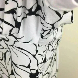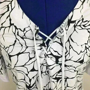 Liz Claiborne size S short sleeve lace front, jewel neck T-shirt. Black and white with white band on sleeves. Ties have silver accents.