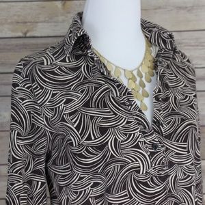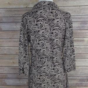 LIZ LANGE MATERNITY Brown and Beige Abstract/Swirl Print 3/4 Sleeve Collared Women's Maternity Dress, Size Small. This stylish pullover maternity dress has a beautiful brown and beige abstract/swirl print design, 3/4 sleeves with optional fold-up cuffs, collared neck with a button down v-neckline on the front bodice, and a removable waistline tie. The material is 50% Cotton, 45% Rayon, and 5% Spandex. The approximate measurements are as follows: Length = 36", Bust = 36", Hips = 38".