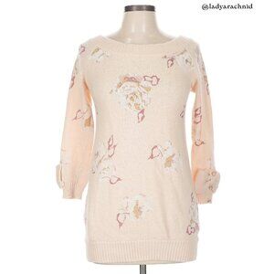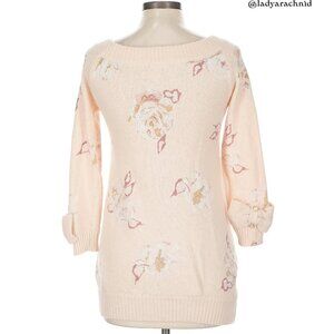 Super soft angora blend sweater dress with abstract rose print. Lovely bow and button details adorn the cuffs. Tagged a Japanese free size "F." Measures about 16" pit to pit, 27" shoulder to hem, and 21" shoulder to wrist. Probably best for sizes XS to medium. If you're taller it could be worn as a tunic. Excellent condition, has a few "fuzzies" as angora sweaters tend to get but no holes, stains, or other obvious defects. Feel free to ask any questions. Smoke free home but we do have pets. BIN33