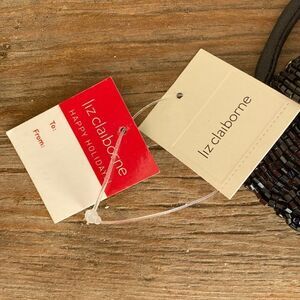 LIZ CLAIBORNE MIMI CROSSBODY BAG/PURSE in a sparkly black. New with tags. Can carry it to ways. Satin fabric long handle with a darling silver and black bead small handle. Perfect for an evening out. Ships from a smoke and pet free home.