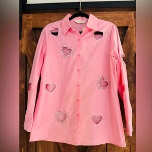 LIZETTE HEART RHINESTONES CUTOUT LIGHT PINK BUTTON DOWN SHIRT Size Large 🩷