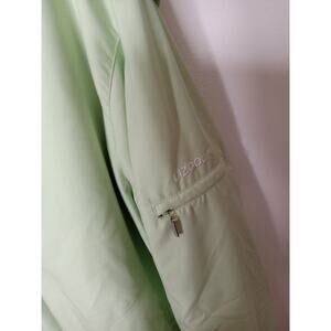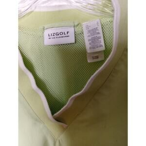 The LIZGOLF Liz Claiborne Women's Large Pull-Over Golf Wind Breaker Jacket is a stylish and functional outerwear piece designed specifically for golf enthusiasts. Made from durable polyester material, this jacket features long sleeves and a sporty windbreaker style, making it perfect for both golfing and casual occasions. The athletic fit and machine washable construction make it convenient and easy to care for, while the classic green color adds a pop of personality to your outfit. With its quality design and brand name, this jacket is a must-have for any female golfer's wardrobe.P18