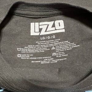 Lizzo is printed on a black tee. 60% cotton/40% polyester.