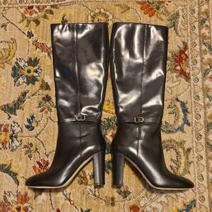 Drawing on the stylish 1970s as inspiration, Morgan knee-high boots make a statement addition to your shoe collection. Crafted in Italy from beautiful grey patent leather, they have an almond-shaped toe, a half inside zip, a 90mm stacked block heel and chic gold buckle detail over the ankle. Wear them with midi dresses and skirts to really play up that Seventies' feel