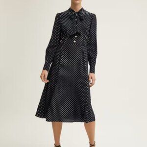 LK BENNETT Mortimer Spring Navy & Ivory Silk Spot Tie Neck Dress Size UK10 US6