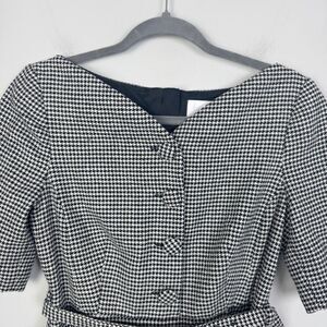 This amazing dress by L.K. Bennett gives off major Jackie O vibes! Black and white classy houndstooth print. Slight Sweetheart V neckline. Button front. Belted waist. Knee length. Back zipper closure. Fully lined. Excellent condition - worn maybe once or twice! Women’s size 6.