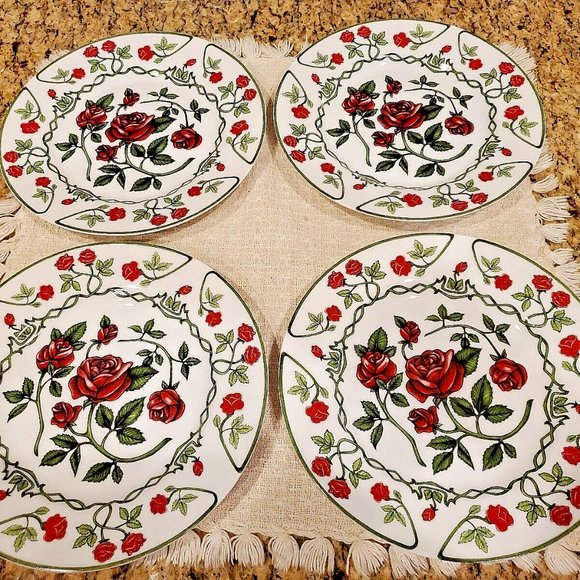 4 Small Unique Plates with gorgeous red roses & green vines ~ 7 1/2" Diameter ~ Very Pretty Plates!
