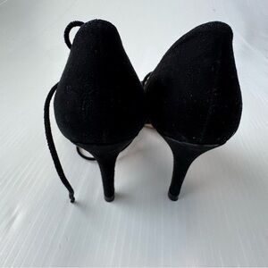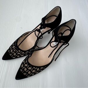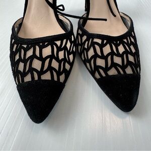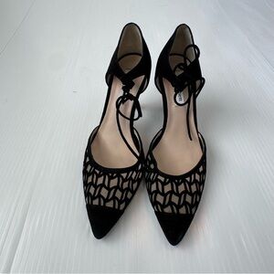 Chic black lace-up heels with intricate mesh design. Perfect for elegant occasions.