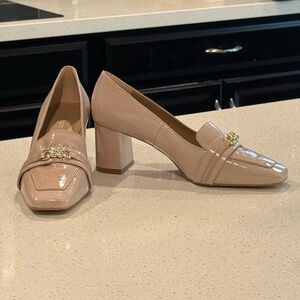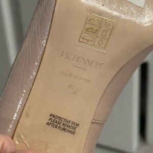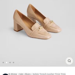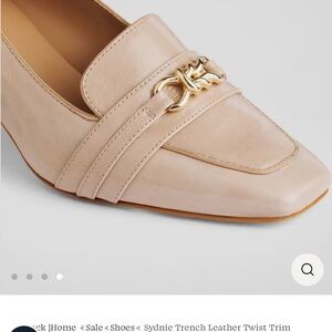 These LK Bennett loafers in a sophisticated cream shade feature a luxurious gold-tone chain across the vamp, offering a touch of elegance. Crafted with a smooth leather finish, they boast a modern squared-off toe and a low heel for comfort and style. Perfect for elevating any ensemble with their timeless design.