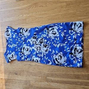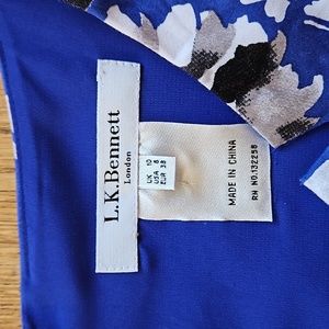 LK Bennett Dena royal blue dress with large white, gray and black floral pattern. Mini capped sleeves. Fully lined. Some stretch. Elegant silhouette and fabric has good weight and structure. Size 6 US. Chest about 17.5", length 40", waist 15.5". A favorite brand of Kate Middleton Duchess of Cambridge.