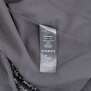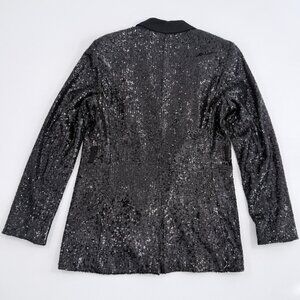 Beautiful and festive! This LK Bennett London black sequin shimmer jacket features a lovely satin collar and trim, offering a charming 1970s smoking jacket vibe. Beautifully tailored with a nice lining, making for a very comfortable fit. It shows no signs of wear and is just waiting to add a touch of sparkle and style to your wardrobe.