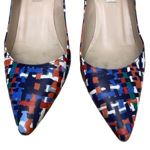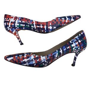 LK Bennett size 37 (6 - based on size guide on their website) red, blue, green, and white paint weave print heels. Heels are approx 2.5” minor wear as shown in photos.