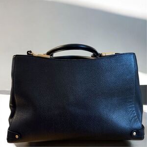 The L.K. Bennett satchel is crafted from luxurious black leather and features gold hardware. Designed for women, Princess Kate, this bag offers a luxurious versatile style with a top handle and crossbody strap. It measures 15 inches in width, 10 inches in height, and 6.5 inches in depth. The bag includes a soft suede lining Minimal marks inside, zipper closure, adjustable strap, and multiple pockets, making it suitable for all occasions. The item is pre-owned. Leather is in beautiful condition. Leather adjustable crossbody strap.