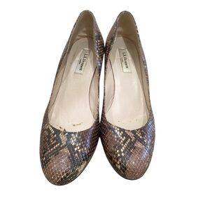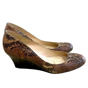 LK Bennett London taupe python print leather round toe wedge shoe. Leather sole. Made in Spain. 3 inch Wood heel. Euc