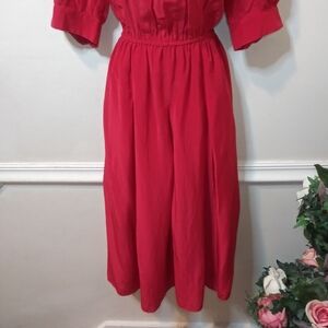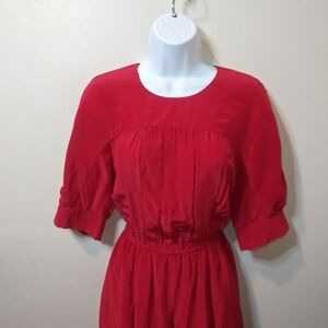 LK Bennett. Brand new with tags size 8 red midi dress with 3/4 sleeves, a pleated bodice and elastic waist. Made of a silk blend. Slips over head with keyhole and button at back of neck. Skirt has pockets and belt loops on both sides but fabric belt is missing, it's how I bought it.