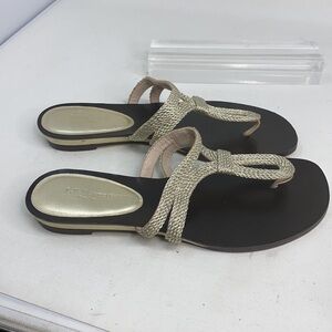 This is a wonderful pair of LK Bennett Sz 39 Open Toe T-Strap Gold Flat Sandals. Fits a narrow 9 or a regular 8.5 The were worn once. Goldtone lurex braided weave backed by a leather lining for extra comfort. Lightly padded leather interior heel. Small wedge for a more elegant look. No issues. A couple of minor scuffs. A slight what looks to be a glue spot on the interior edging of the braiding (from the manufacturer it seems). Not noticeable once on.
