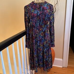 Hidden zipper on the side. Great beautiful dress for traveling. Does not wrinkle.