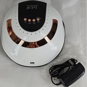 High-powered LKE SUNS2PRO nail lamp with dual light source and smart infrared sensor for fast, even curing across all gel types. Features a sleek design with rose gold handle, LCD timer display, and spacious interior for hands or feet.