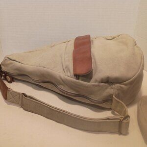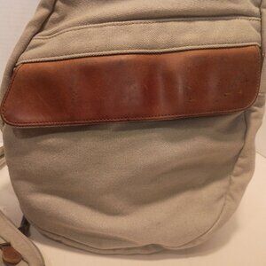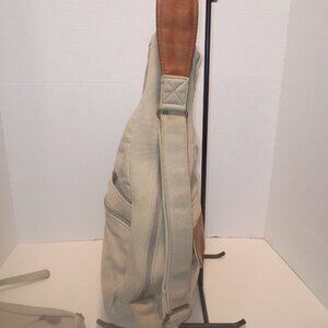 An enduring favorite collaboration between 2 American icons, LL Bean and Ameribag--the teardrop, ergonomically healthy "Traveler" sling pack. This bag is the large size and is tan canvas with natural brown smooth leather accents. Pockets front and back, and zips open to a durable nylon lined interior with organizer slipper pockets. Bonus mini bag with absolutely NO use comes along--amazing it is still together with the big bag!