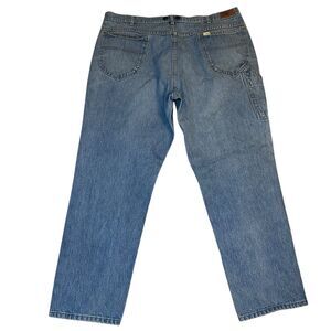 These L.L. Bean Carpenter Blue Jeans Pants for men in size 44x32 are made in the USA from medium wash denim fabric. They feature suspender rivets, pockets, and the L.L. Bean logo. The relaxed fit and cotton material offer comfort, suitable for a casual American-themed style. Inseam 31" Excellent condition. No rips/holes/tears/excessive stretching/stains/discoloration/snags. Kept in a smoke/pet free home.