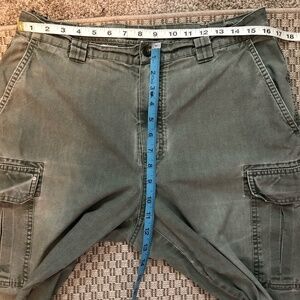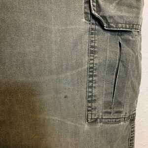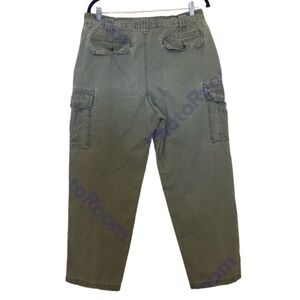 ♡ SIZE: 34x29. Green/Olive. 100% cotton, Descriptive photo measurements differ from items size tag, Distressing throughout, Color Distressing, buttons, Diagonal front pockets, Cargo Pockets, Belt loops, Stain, This looks like vintage pants to me, Pre-loved item looks in good condition to me, please be aware of some natural wear, stains and distressing. See descriptive photos for approximate measurements, condition & care/material tags. Photos of model are for approximate fit & style. Thank you! ♡