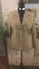 Three button front in colors of green, red and hint of yellow plaid design on a creamy tannish background.