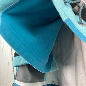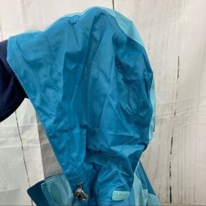 This is an excellent used condition winter coat. There are two pieces that come apart easily with a zipper and three snaps. The outer shell is waterproof and can be used as a light raincoat or worn over the inner shell as a thick insulated weather resistant winter jacket. Inner shell is a zip up fleece jacket. The hood zips into the collar