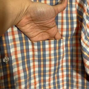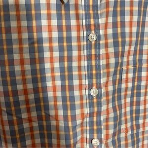 In good preloved condition. Has no signs of wear, stains, or tears. Women’s button down 3/4 sleeve top. Colors are orange, Blue, and white. 100% cotton.