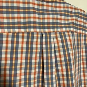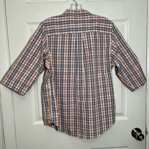 In good preloved condition. Has no signs of wear, stains, or tears. Women’s button down 3/4 sleeve top. Colors are orange, Blue, and white. 100% cotton.
