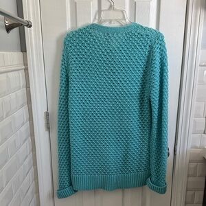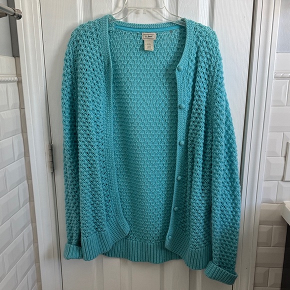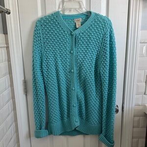 Cozy baby blue knit cardigan. Button-up front. Textured knit design. Perfect for layering.