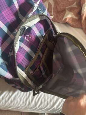 L.L.Bean Deluxe Book Pack Backpack, Purple Plaid Pattern. This classic school and travel backpack features durable weather-resistant fabric with two main compartments and a front organizer pocket. Includes a reflective strip for safety and a headphone port. Great for students or hiking. Good pre-owned condition with some light wear and marks on the front as shown in photos-very clean. Zippers and straps are fully functional.