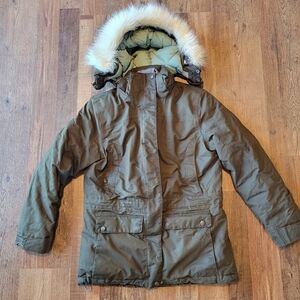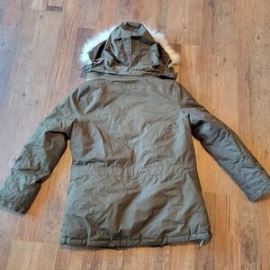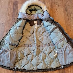 in good condition - has some normal wear, small holes on bottom inner aspect of coat where the elastic pull cord is but does not affect use of the elastic pull cord or wearability. some wear also to the main zipper at the bottom but again does not affect wear at all. zipper still works perfectly. very thick sturdy zipper. please see photos