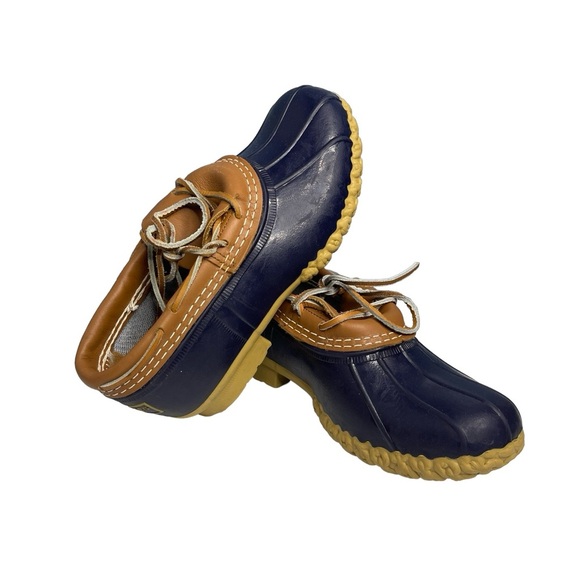 L.L. Bean Bean Boots made in USA 6 M leather duck boots low top lace up VN# 1003589. Navy blue rubber and leather.