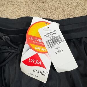 The product is a pair of L.L. Bean BeanSport swim bottoms in black, designed specifically for women in size Large. These swim shorts feature a solid pattern and are made from a blend of nylon and Lyrcra materials for comfort and durability. With a pull-on style, these bottoms are perfect for beach days or lounging by the pool, offering both style and functionality for swimming and water activities.