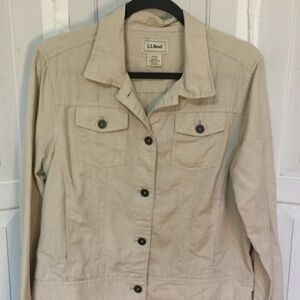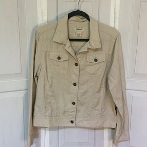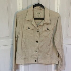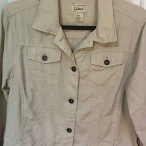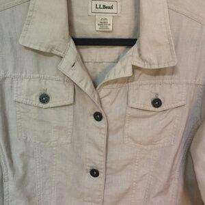 Stylish beige linen and cotton trucker/jean jacket. Features button closure. Two chest pockets and 2 waist pockets. Lightweight and unlined.