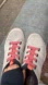 Stylish sneakers featuring a beige body with pink laces. Perfect for everyday wear.
