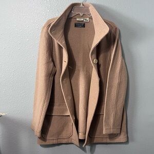LL Bean Bellandi 100% Wool Coat Womens Sz XL Tan Mid Length Jacket Vintage premium fabric made in Italy. Shoulder to hem 31”. Wrist to shoulder seam 26.5”. Armpit to armpit 24”. No rips. No stains. Excellent Condition!